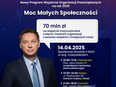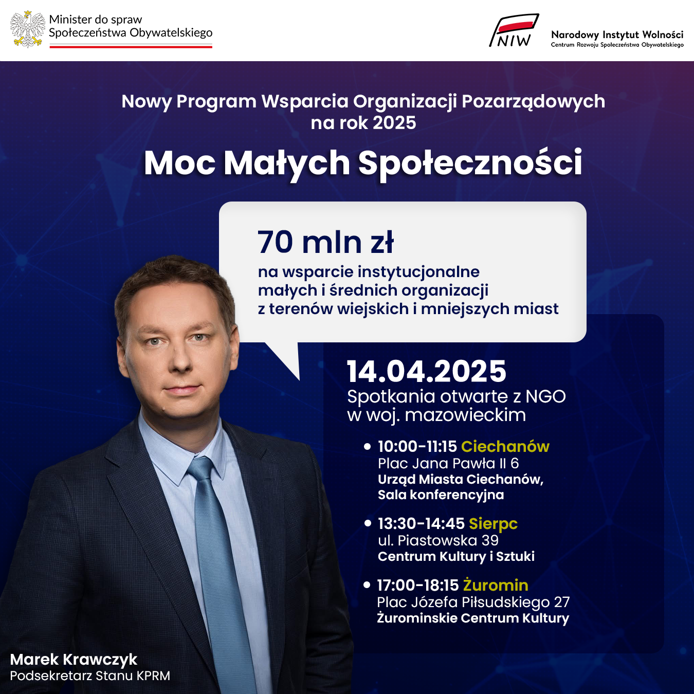 Ministra ds. Społeczeństwa Obywatelskiego Adriana Porowska oraz Podsekretarz Stanu w KPRM Marek Krawczyk serdecznie zapraszają przedstawicieli trzeciego sektora do udziału w spotkaniach dotyczących nowego Rządowego Programu Wsparcia Organizacji Pozarządowych na rok 2025 – „Moc Małych Społeczności”.