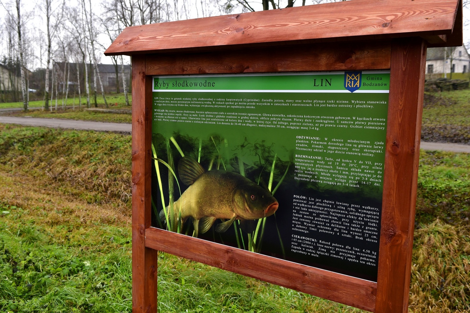 "Ścieżka edukacyjna dla dzieci i młodzieży z terenu Gminy Bodzanów". Wzdłuż ścieżki, przy istniejącym stawie ustawiono 10 tablic informacyjnych, dzięki którym zainteresowani będą mogli poznawać gatunki ryb słodkowodnych. Ponadto zamontowano 10 ławek oraz 3 ławostoły z planszami do gry w szachy i chińczyka. Wykonawcą zadania była firma projektowo- usługowa EKO –DEKOR.
