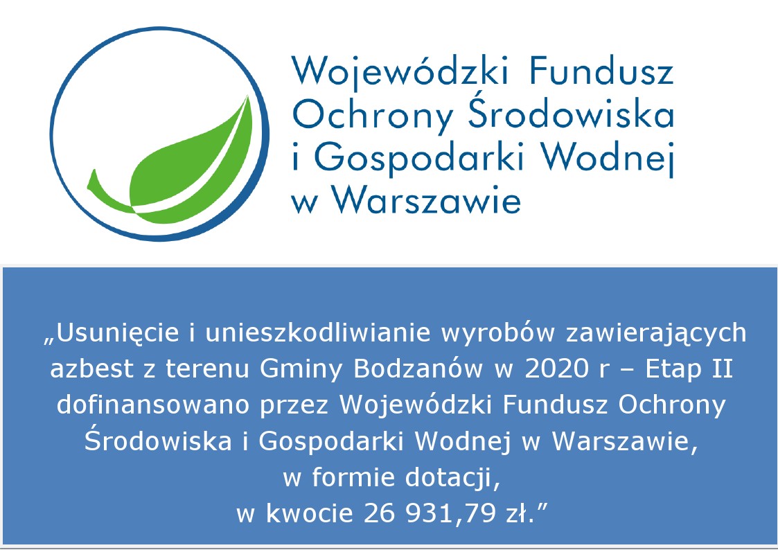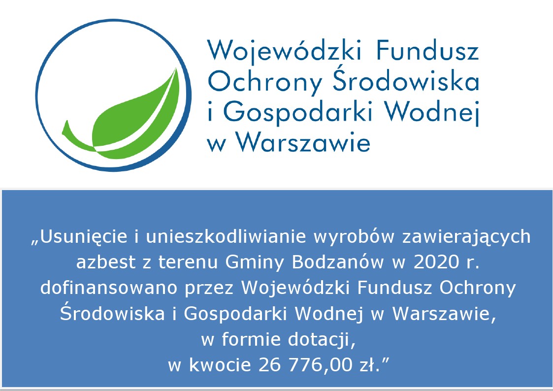W 2020 roku Gmina Bodzanów pozyskała dwukrotne dofinansowanie z Wojewódzkiego Funduszu Ochrony Środowiska i Gospodarki Wodnej na odbiór i utylizację płyt azbestowych z terenu Gminy Bodzanów. W pierwszej dotacji pozyskano 80% dofinansowania, czyli 26 7600,00 zł na łączną ilość 66,940 Mg odebranych wyrobów zawierających azbest. Kolejna dotacja to 100% dofinansowania w wysokości 26 931,79 zł na 73,560 Mg odebranych płyt.