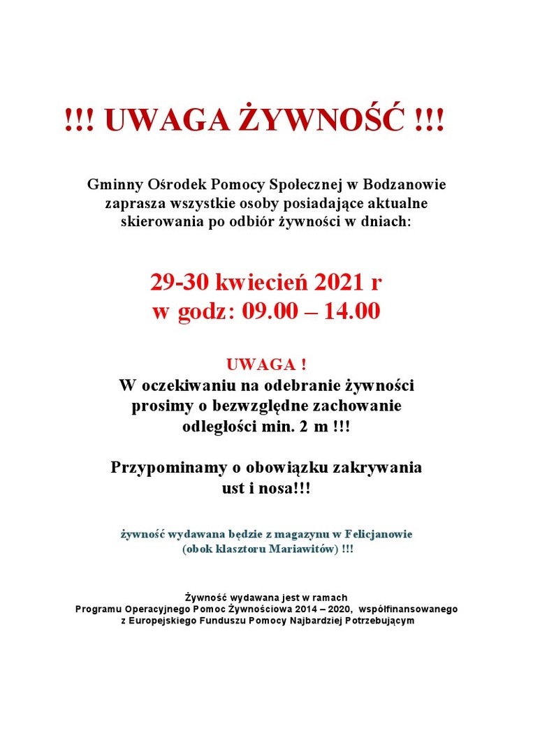 Informacja Gminnego Ośrodka Pomocy Społecznej Bodzanów o planowanym wydawaniu żywności