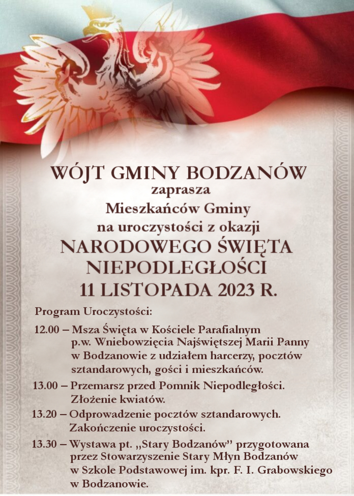 Zaproszenie na uroczystości z okazji Narodowego Święta Niepodległości 11 Listopada 2023 r.